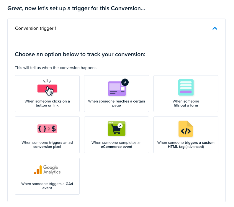 The final option is for developers and the more technically advanced. It requires your developers to write code that will trigger this unique script provided to you when selecting this option. Your developers will write the code that captures the events you want to trigger before this script runs, indicating that a conversion took place.