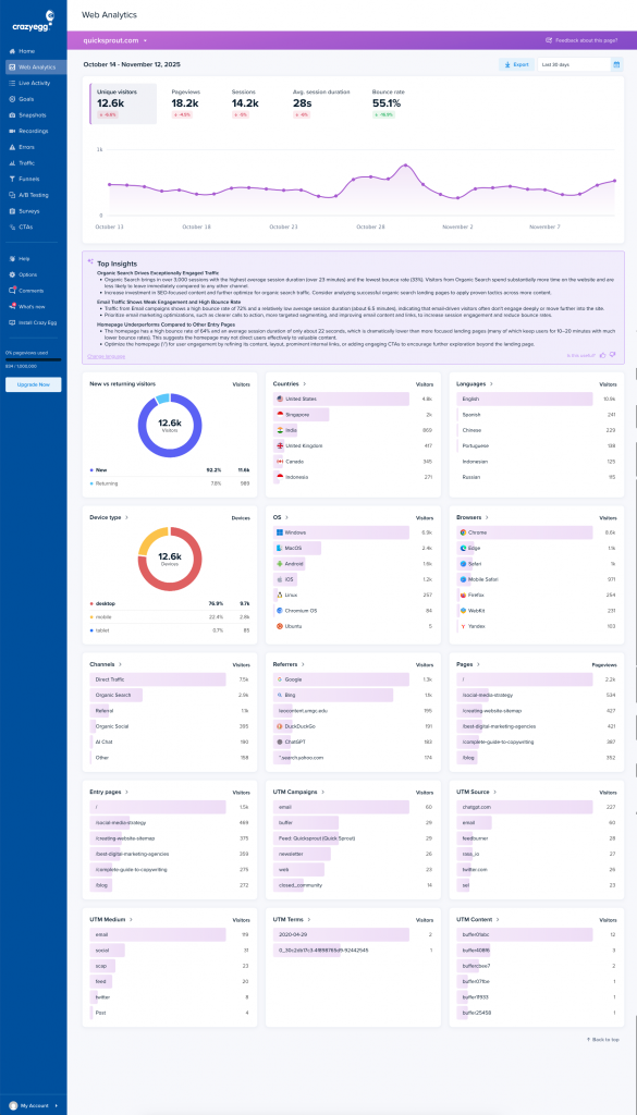 Crazy Egg’s Web Analytics feature gives you a clear, visual overview of how people are finding and interacting with your website. It’s designed to help you uncover what’s working and what’s not, across traffic sources, devices, engagement, and more.